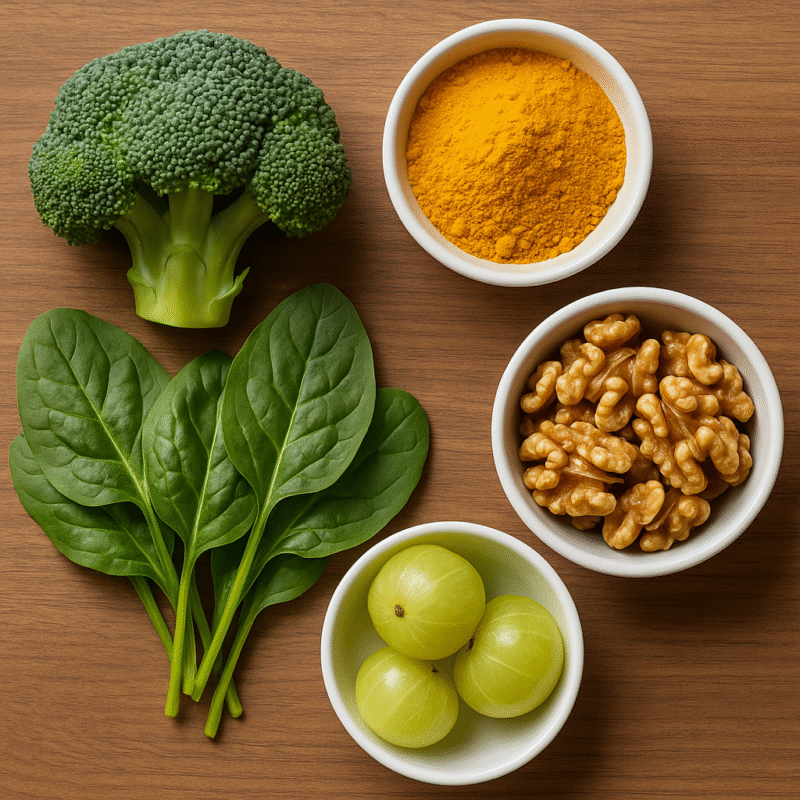 “Top lung-friendly foods including spinach, turmeric, garlic, avocado, walnuts, amla, and broccoli — natural sources to improve lung function and oxygen absorption.”